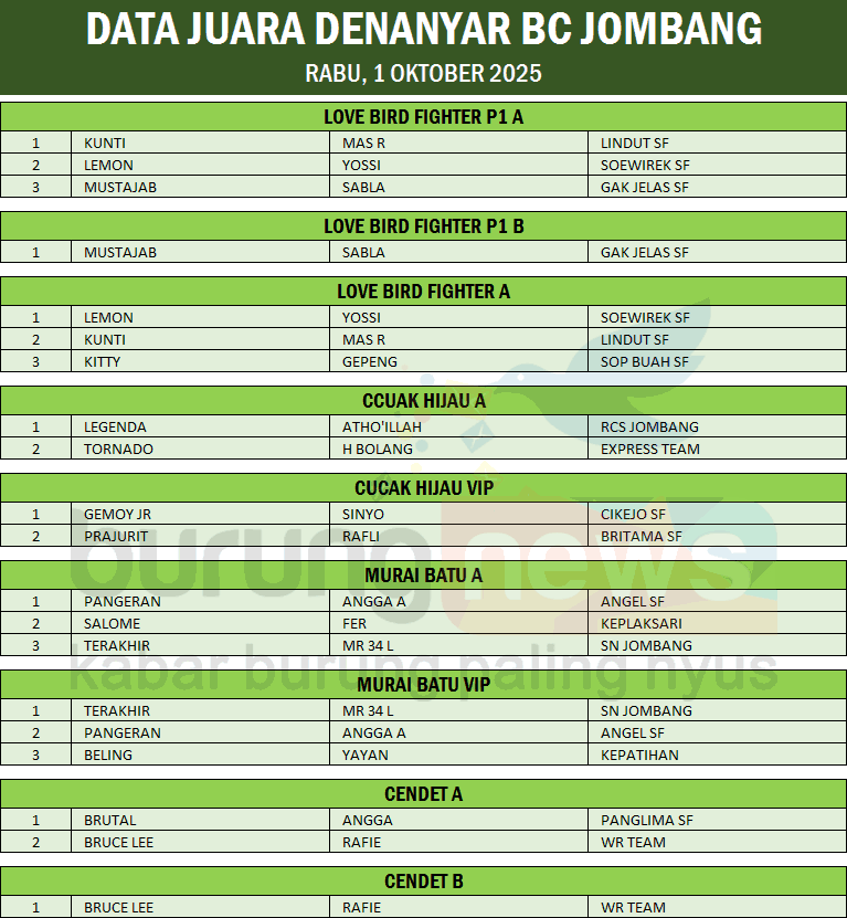 Dua gaco yang jadi rival berat Pangeran di gelaran Denanyar BC pada Rabu (1/10) kali ini adalah Salome milik Fer dari Keplaksari dan Terakhir orbitan Mr 34L dari SN Jombang. Di kelas A, kedua gaco berhasil merebut juara II dan III.