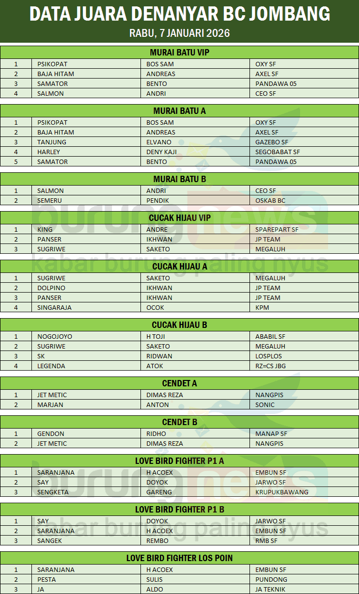 Di kelas Cucak Hijau A, Sugriwe diapit duo gaco andalan Mr Ikhwan dari JP Team yang biasanya main di kelas Cendet. Namun, kehebatan Sugriwe masih sulit ditundukkan, dan duo andalan JP Team harus rela menempati podium dua dan tiga. (juned)