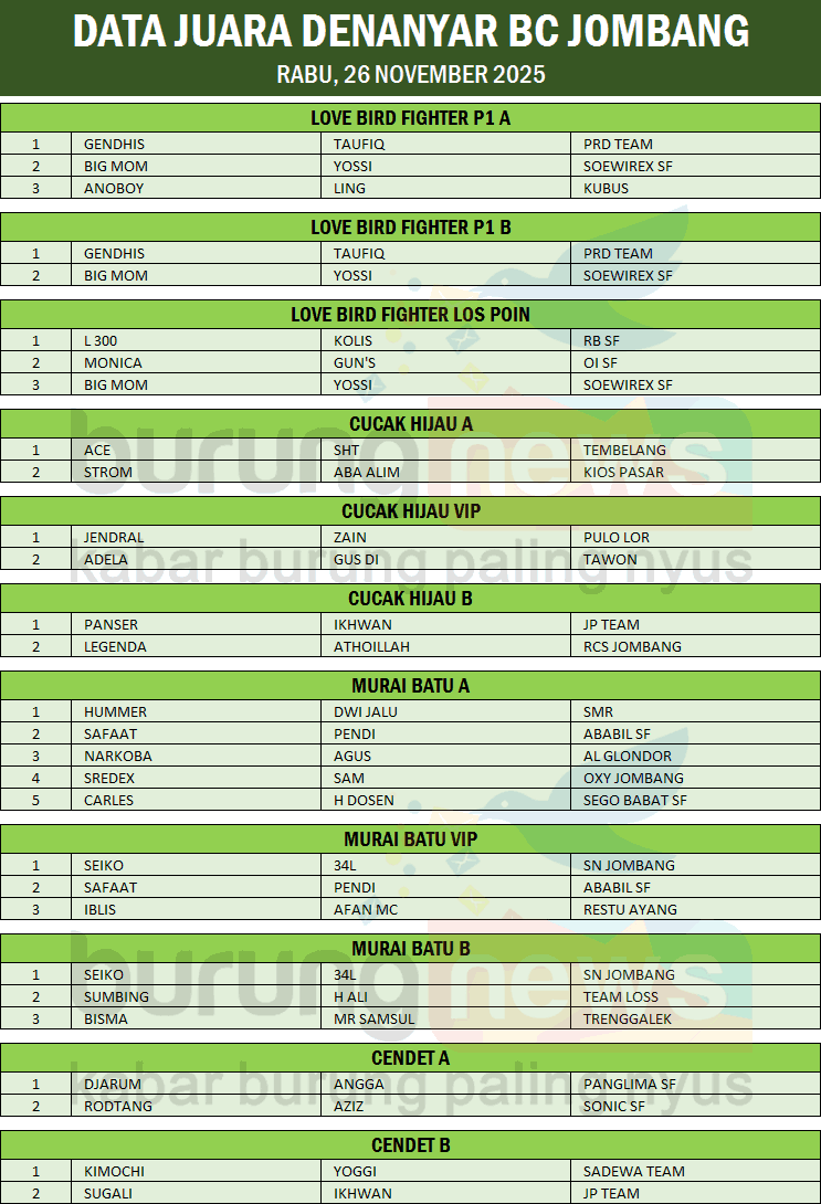 Seiko andalan Mr 34 L dari SN Jombang berhasil meraih double winners di gelaran Denanyar BC di Lapangan Pasar Desa Denanyar Jombang pada Rabu 26 November 2025. Seiko dengan gaya nge-play obral suara roll dan pukulan, berhasil merebut juara I di kelas Murai Batu Vip dan B.
