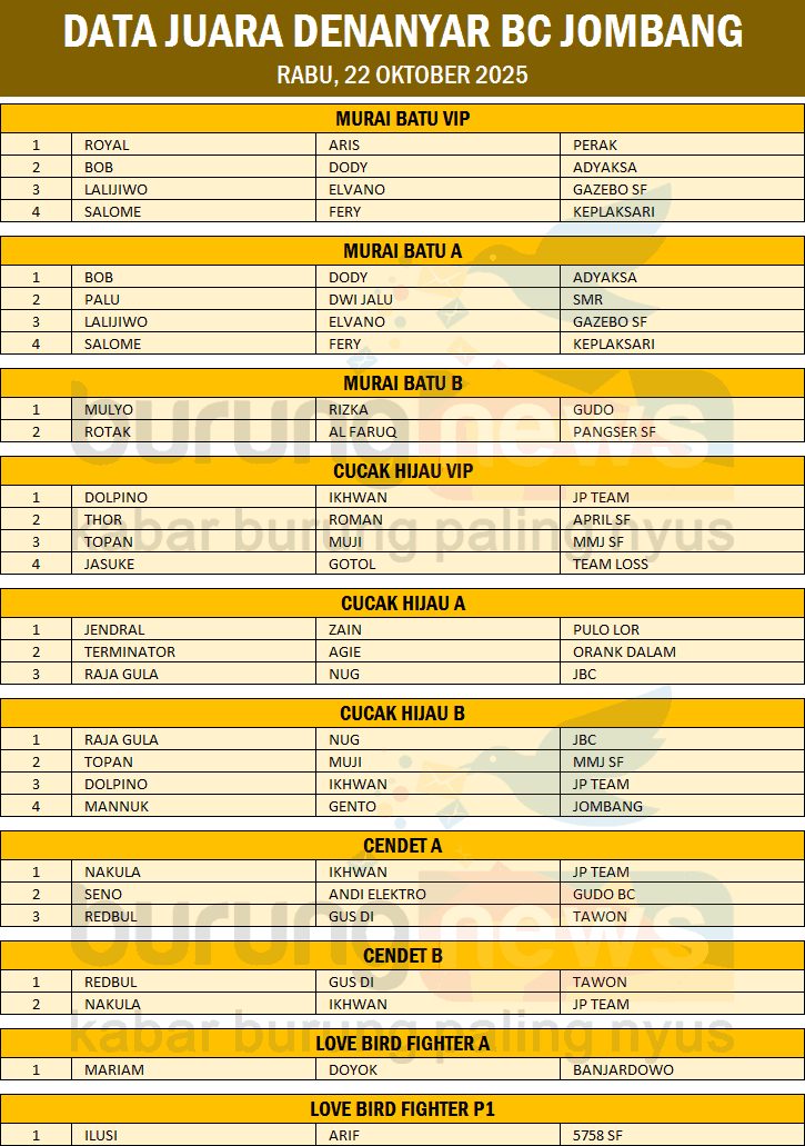 Persaingan cendet Jombang pun makin asik, bro. Dengan munculnya pemain-pemain baru yang berani tampil dan punya materi mewah, dunia cendet di kota santri ini makin hidup, rame, dan penuh kejutan. Siap-siap, di even berikutnya bisa jadi Nakula bakal makin menggila!