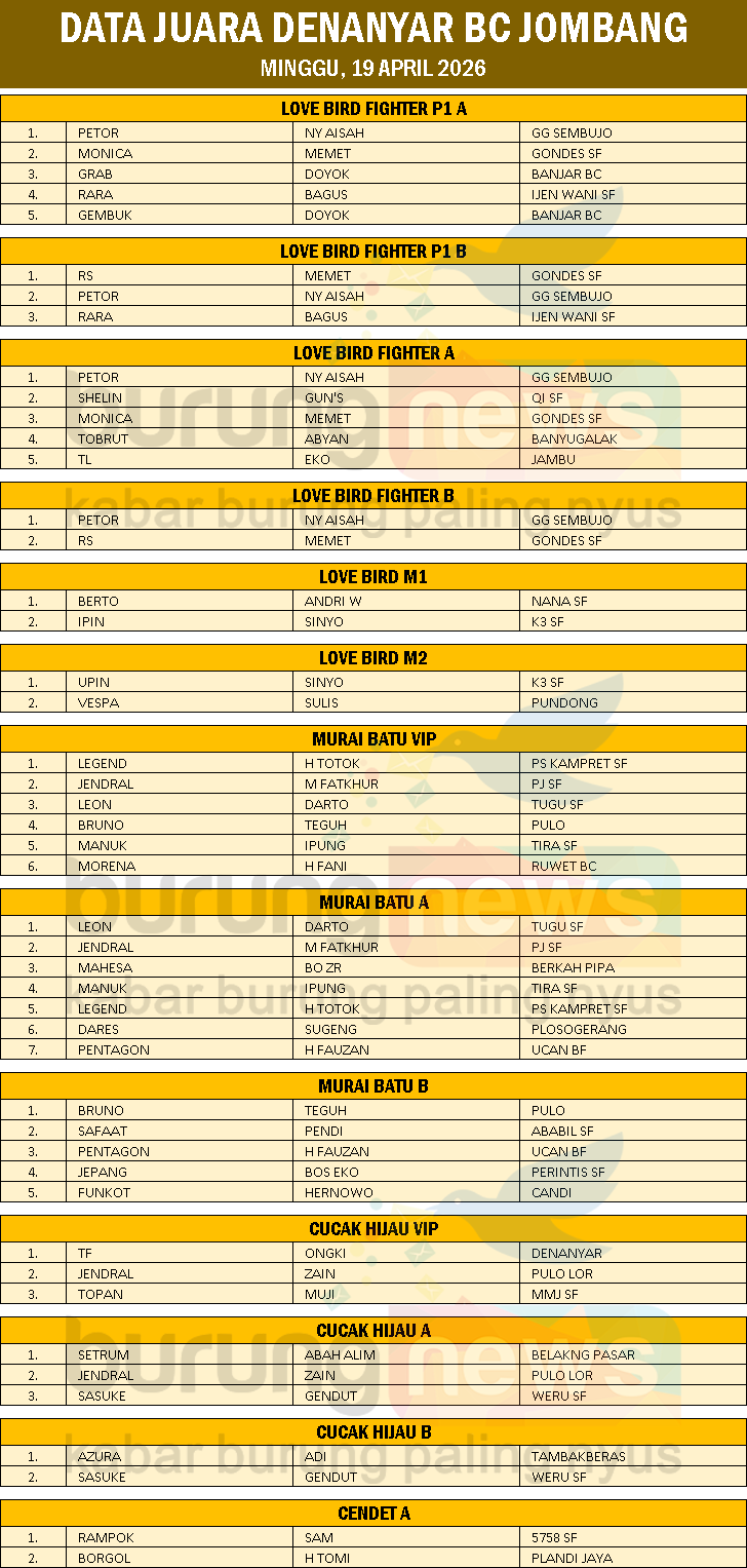 Seperti udah jadi tradisi, gantangan Denanyar BC memang gak pernah sepi peminat. Minggu (19/4) di Lapangan Pasar Desa Denanyar Jombang, kelas Murai Batu (MB) sama Love Bird full sesak, peserta meluber.