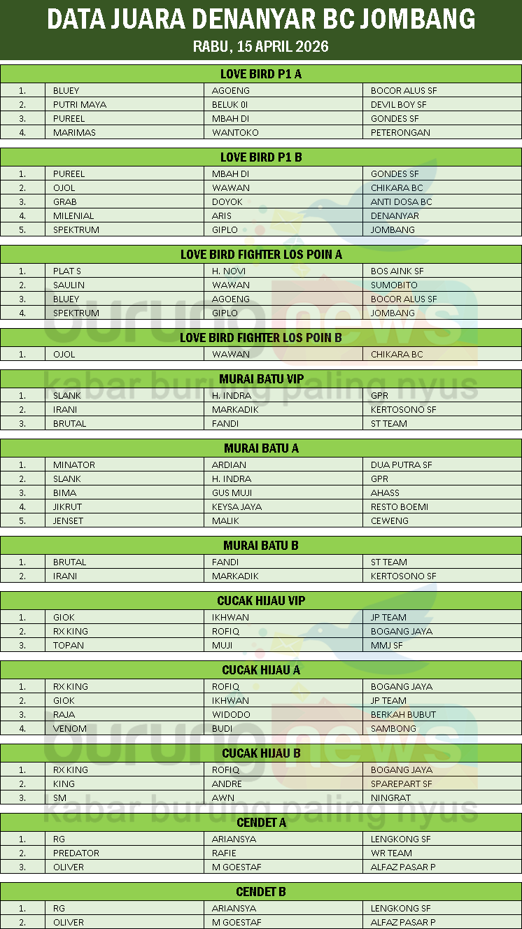 Dari situ kelihatan banget, kalau peta persaingan love bird di Denanyar BC ini agak “random tapi seru”. Kadang ada yang meledak banget, kadang juga cukup main aman sudah bisa podium. Artinya? Peluang buat menang itu kebuka lebar, terutama buat pemain baru.