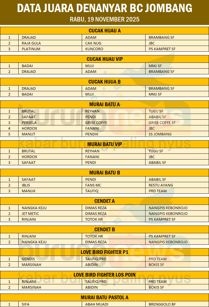 Di kelas Cucak Hijau, Drajad andalan Adam dari Brambang SF juga mampu mendominasi podium. Di kelas gelaran Denanyar BC ini, Drajad main tiga kali dan berhasil meraih juara I, II, dan I. Gaco yang mampu mengalahkan Drajad di kelas Vip adalah Badai milik Muji dari MMJ SF. (juned)