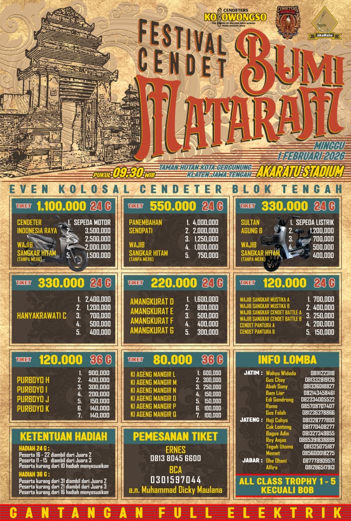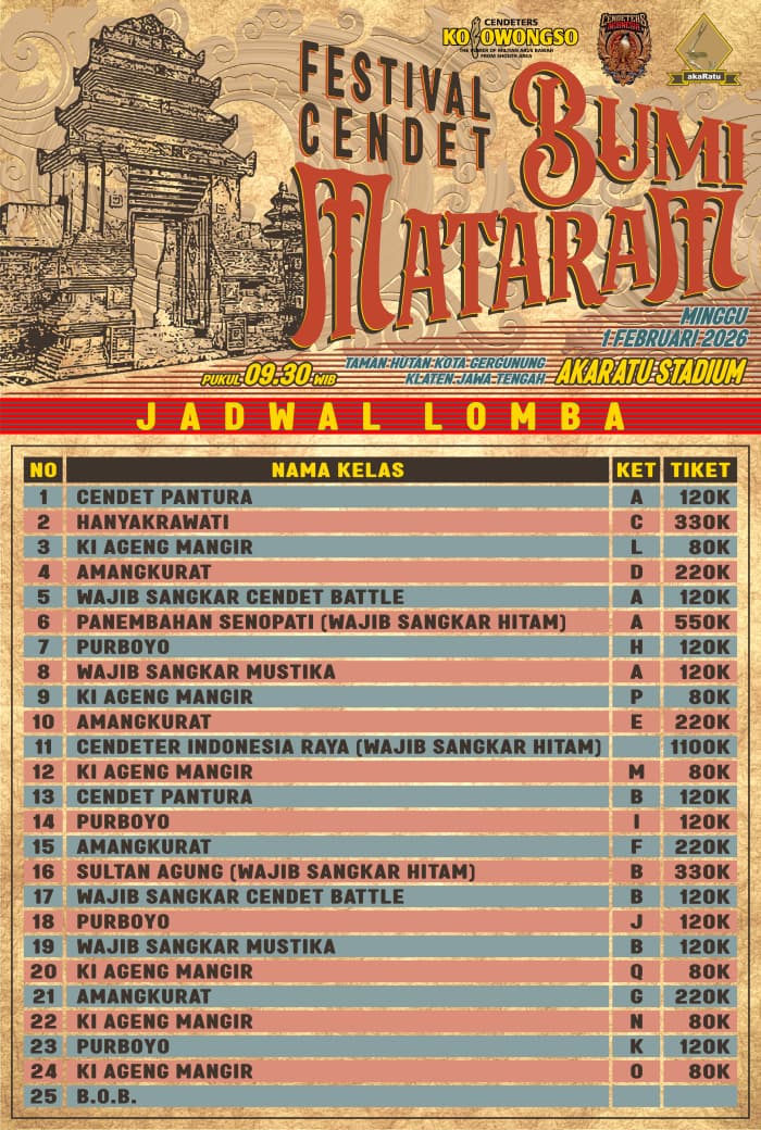 FESTIVAL CENDET BUMI MATARAM TAMAN HUTAN KOTA GERGUNUNG Minggu, 01 Februari 2026 Jam 10:00 Diliput oleh burungnews.com DOWNLOAD BROSUR DOWNLOAD JADWAL LOMBA