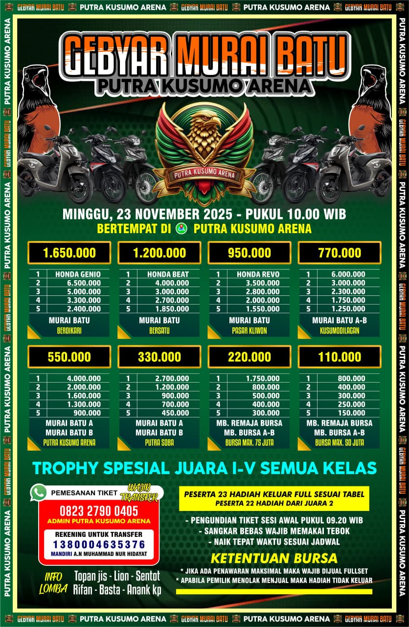 GEBYAR MURAI BATU PUTRA KUSUMO ARENA PUTRA KUSUMO ARENA Minggu, 23 November 2025 Jam 10:00 Diliput oleh burungnews.com DOWNLOAD BROSUR