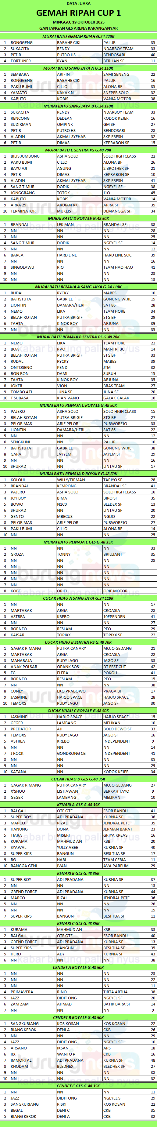 Gunung Wijil Team yang dikawal oleh Purnama Gocik sukses mengorbitkan beberapa burung juara di event kali ini. Yang paling mencuri perhatian adalah penampilan Batistuta di kelas murai batu remaja. Tampil dengan kualitas materi di atas rata-rata, show yang ditampilkannya juga kekinian sehingga bisa mencuri perhatian juri dan penonton. Setelah gelaran Gemah Ripah Cup 1, Gocik dan kawan-kawan akan meneruskan perburuan juara di gelaran Cendet Karanganyar Bersatu pada tanggal 26 Oktober 2025 di CV Gendeng Mas Kebak Kramat.
