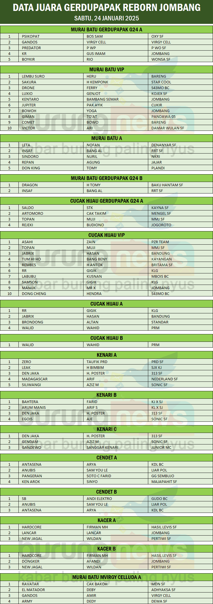 Dengan ramainya kelas VIP dan mulai bersinarnya kelas Cucak Hijau G24, Gerdupapak Reborn kian menegaskan diri sebagai gantangan yang ramah untuk semua level pemain. Dari kelas baru hingga kelas elite, semua dikemas kompetitif dan berkelas — sebuah sinyal kuat bahwa sektor cucak hijau siap menjadi salah satu tulang punggung Gerdupapak Reborn di musim 2026. (juned)