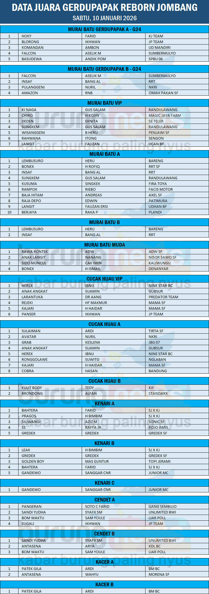 Menjelang Anniversary JBC pada 18 Januari, kelas kenari di arena Gerdupapak Reborn tidak pernah sepi. Kuota G24 bisa dipastikan penuh dan jadi indikasi trend apik kebangkitan kelas kenari di tahun 2026.