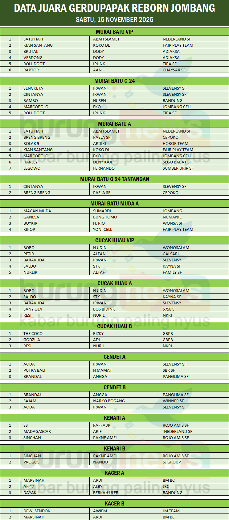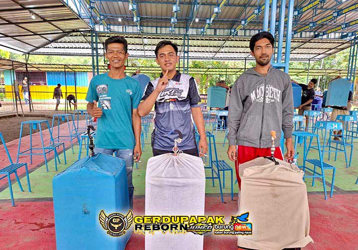Sementara itu, di kelas Murai Batu A, podium teratas dikuasai Satu Hati milik Abah Slamet dari Nederland SF. Gaco ini juga jadi kampiun di kelas Murai Batu Vip, yang sekaligus menjadi laga pembuka Gerdupapak Reborn.
