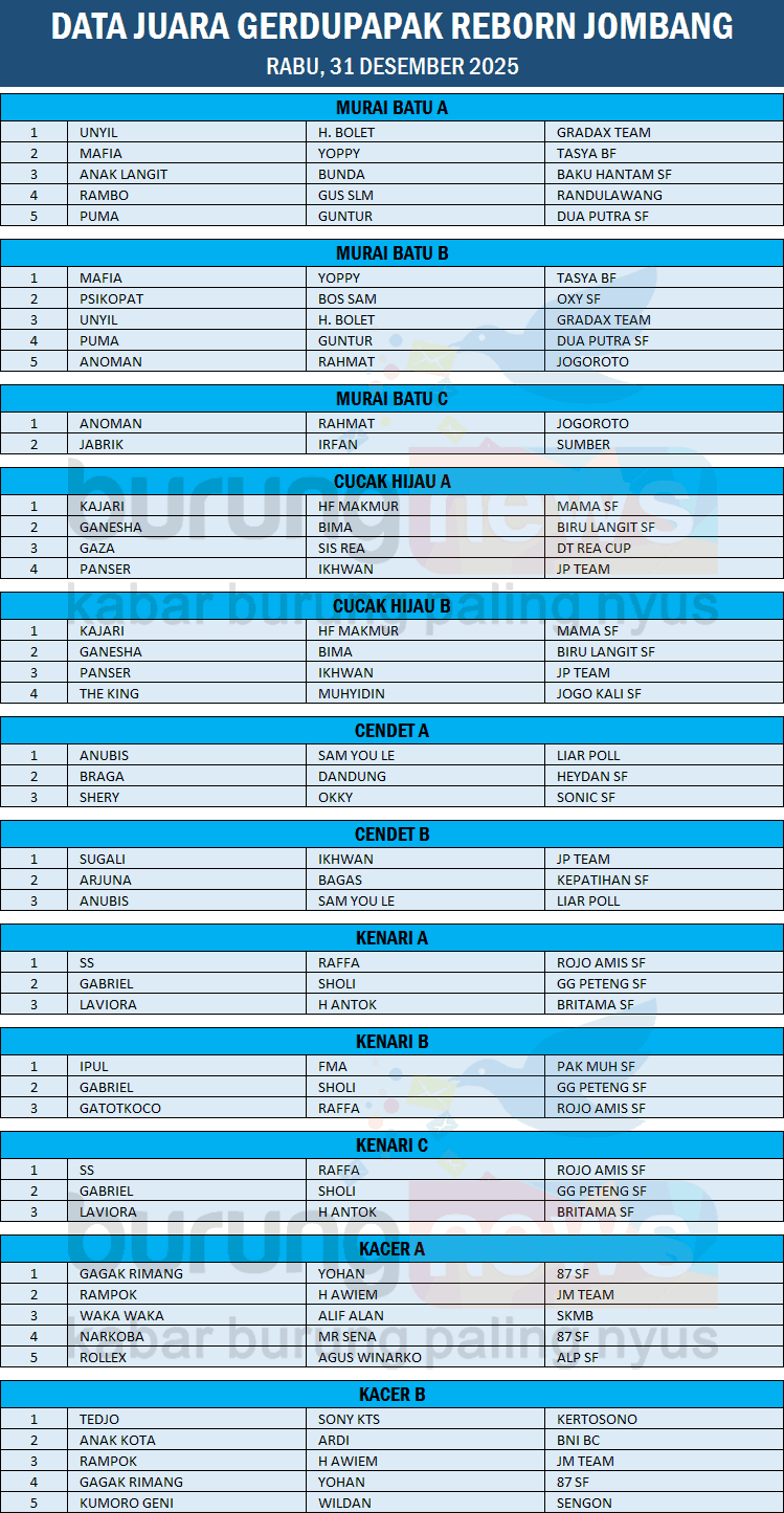 Secara keseluruhan, pertarungan di gelaran Gerdupapak Reborn yang berlangsung di Lapangan Waduk Parimono, Jombang, Rabu (31/12) benar-benar terasa panas. Bukan tanpa alasan, karena banyak pemain terlihat sudah mulai ancang-ancang dan menyiapkan gaco terbaiknya.