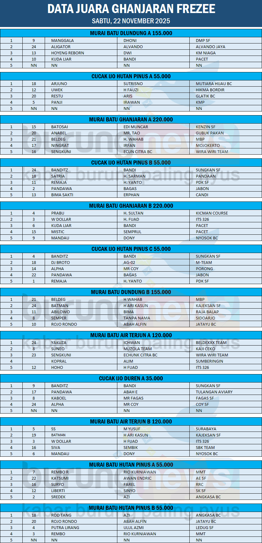 Ghanjaran Stadium dalam latber rutinnya, Sabtu, 22 November 2025 berjalan sukses dan lancar. Hanya memainkan kelas cucak dan murai batu, namun pesertanya cukup mengembirakan.