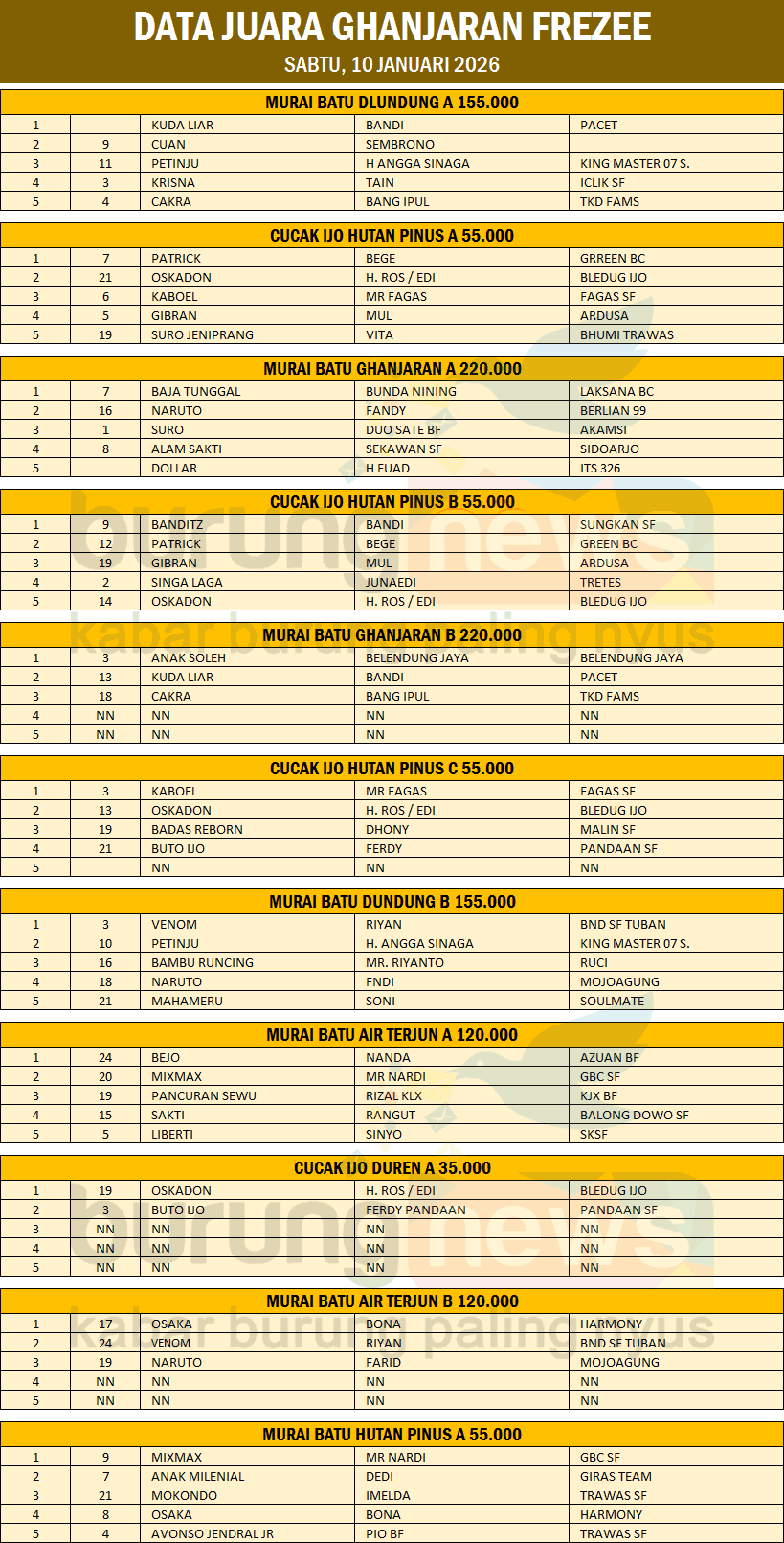 Diguyur hujan yang sangat lebat, latber rutin Ghanjaran Stadium, Sabtu, 10 Januari 2026, berjalan lancar dan sukses. Lomba yang berlokasi di depan Taman Ghanjaran, Trawas Mojokerto ini hanya memainkan kelas murai batu dan cucak ijo.