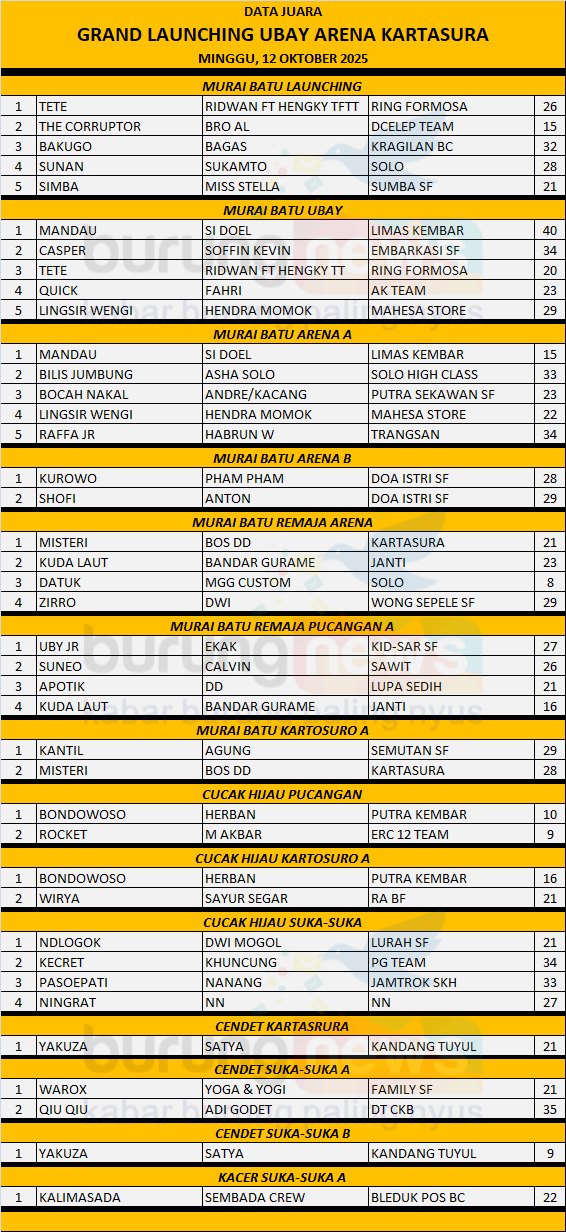 Grand Launching Ubay Arena yang diadakan pada Minggu, 12 Oktober 2025 di Ds Jegongan, Pucangan, Kartasura berlangsung lancar dan kondusif. Kelas-kelas utama berhadiah sepeda motor seperti murai batu terpantau dipadati peserta.