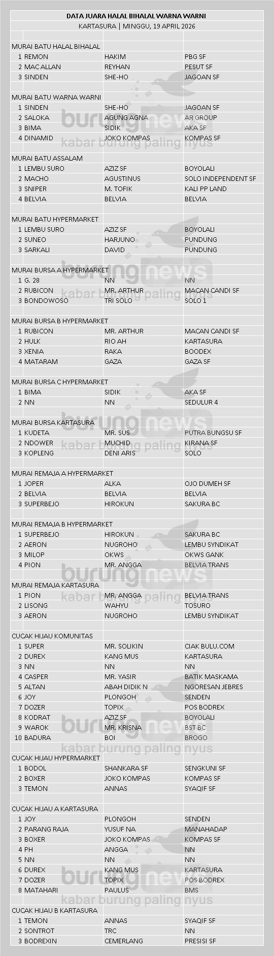 Halal Bi Halal Warna Warni yang dilaksanakan pada Minggu, 19 April 2026 di Assalaam Hypermarket Kartasura berlangsung sukses. Remon, amunisi milik Hakim PBG SF berhasil meraih podium pertama di kelas utama Murai Batu Halal Bi Halal.