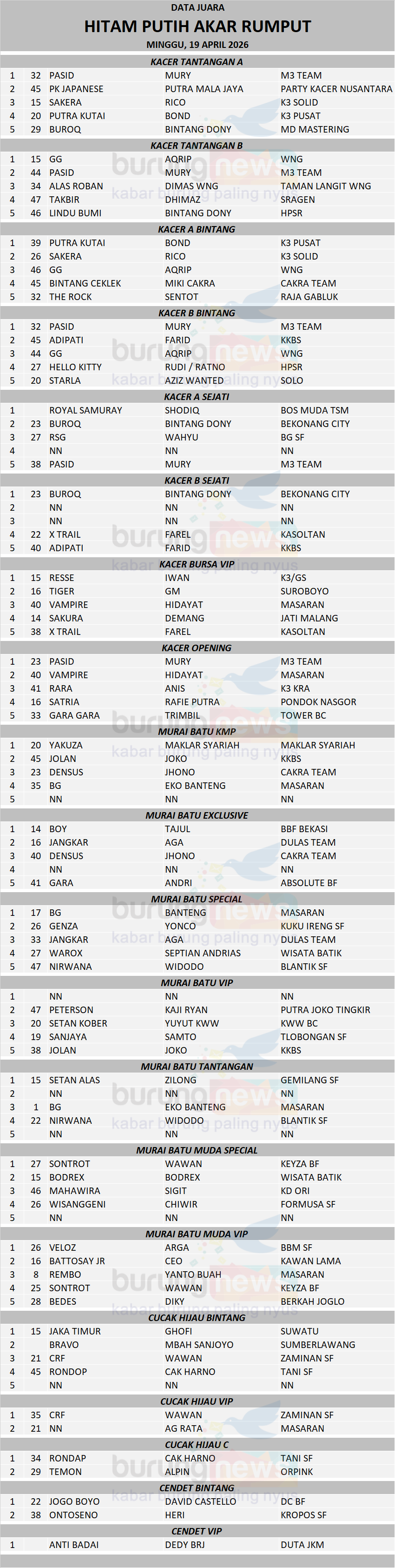 Kacer Pasid milik Mury M3 Team Sragen keluar sebagai bintang lapangan di Hitam Putih Akar Rumput setelah meraih tiga kali juara pertama alias hatrik. Tampil perdana paska mabung, kacer Sakera (Rico-K3 Solid) comeback di jalur juara dengan meraih podium kedua, dan ketiga.