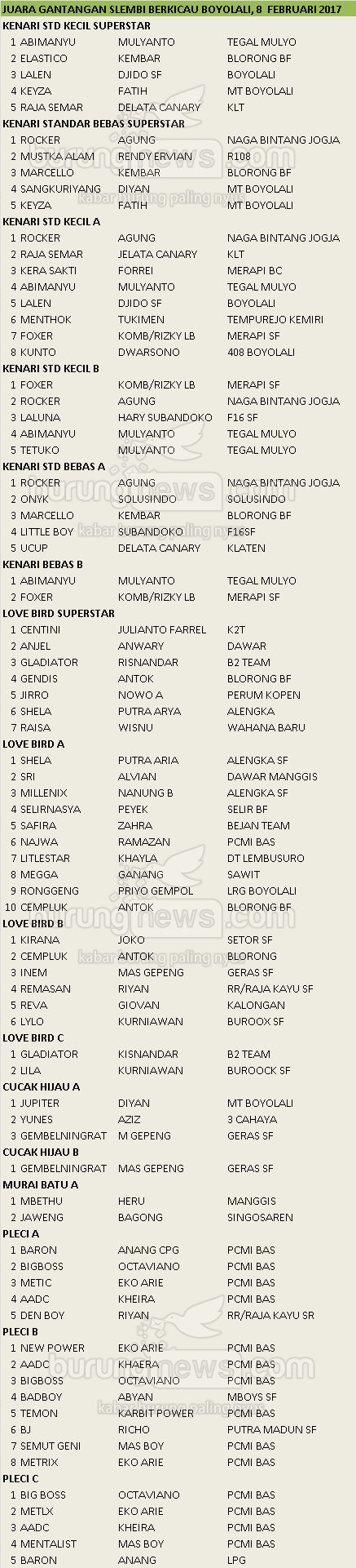Judul : JUARA GANTANGAN SLEMBI BERKICAU BOYOLALI, 8 FEBRUARI 2017