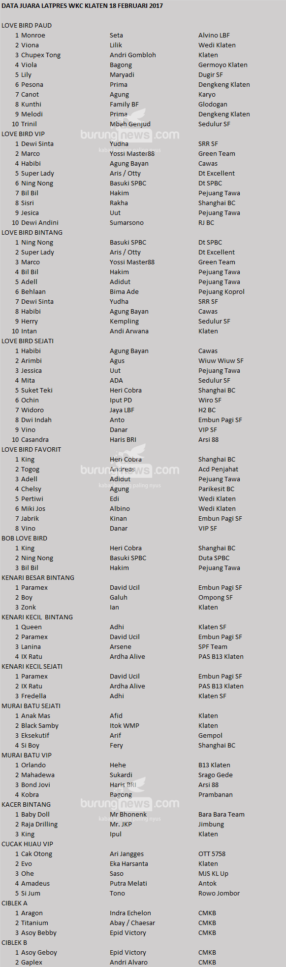 Hasil Lomba Burung