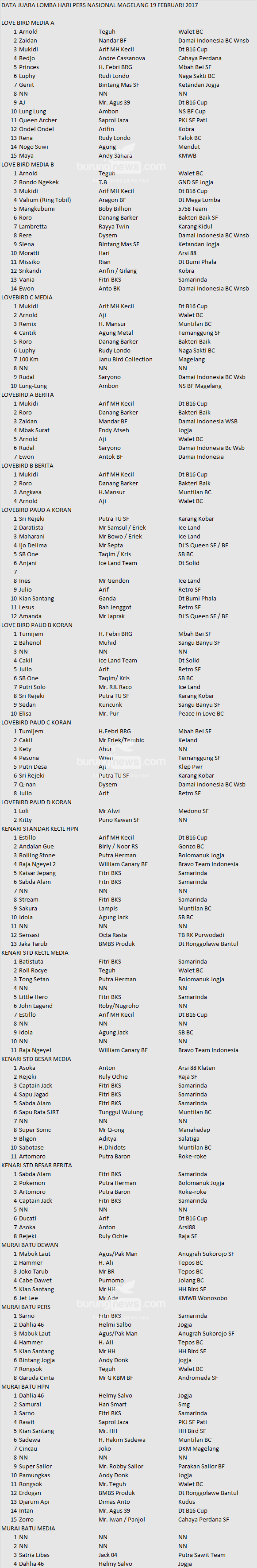 Judul : JUARA HARI PERS NASIONAL MAGELANG 19 FEBRUARI BAG 1 LOVE BIRD KENARI MURAI BATU