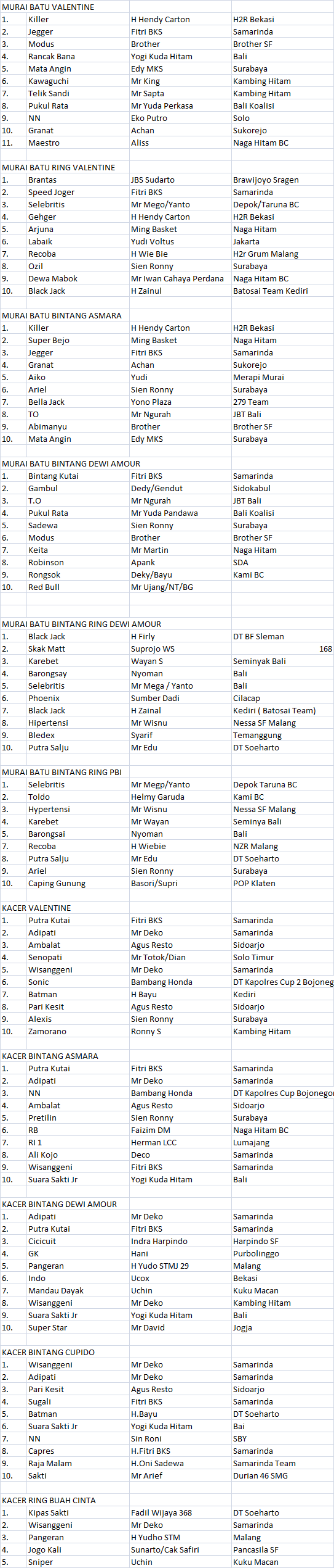 DATA JUARA valentine PBI Jogja murai batu dan kacer