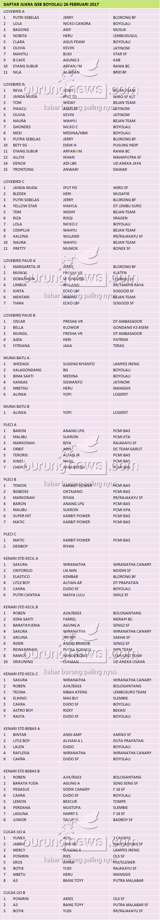 Judul : DAFTAR JUARA GSB BOYOLALI 26 FEBRUARI 2017