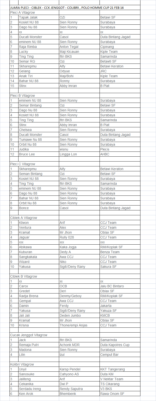 Deskripsi :Data Juara Pleci, Ciblek, Jengot, Colibri di Polo Homme Cup Jakarta 21 Februari 2016