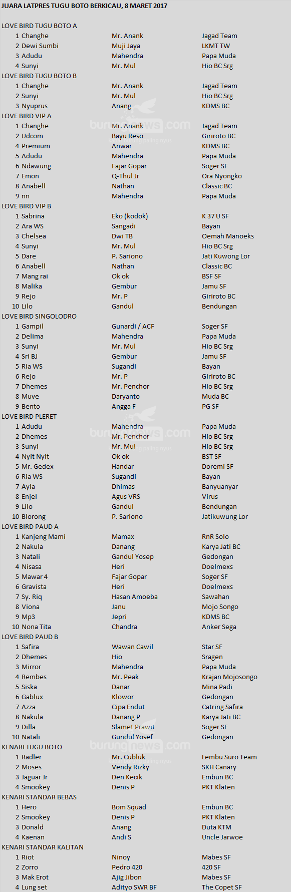 Hasil Lomba Burung