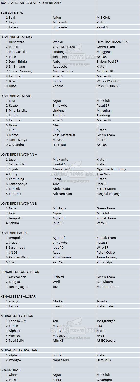 Hasil Lomba Burung
