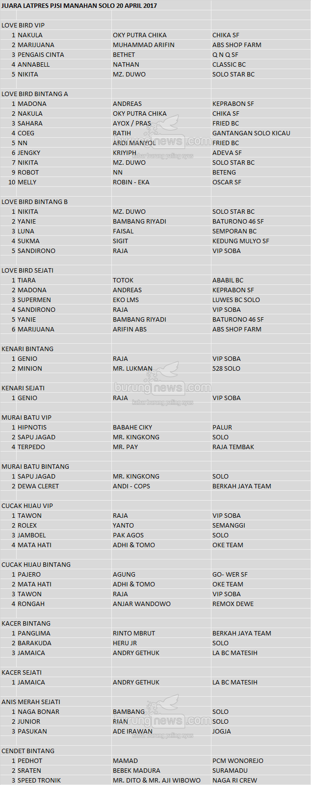 Hasil Lomba Burung