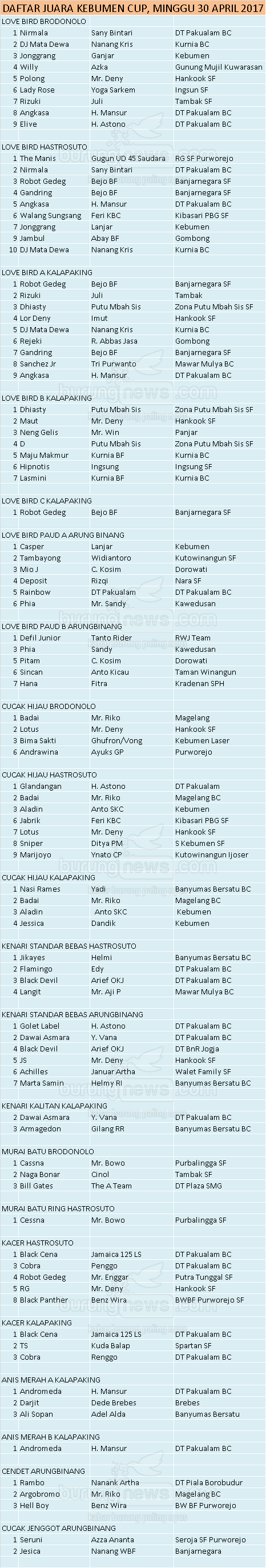 DATA JUARA GRAND LAUNCHING JOGJA BIRD ARENA: MB Sapujagad Hatrik, CH Petrok Double Winner