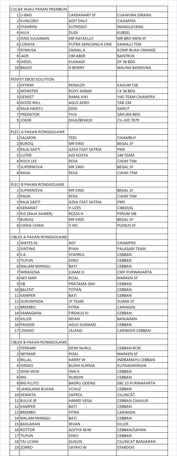 Deskripsi :DARTA JUARA HUT TVRI JABAR 13 MARET, KELAS CUCAK HIJAU, PENTET,PLECI, DAN CIBLEK