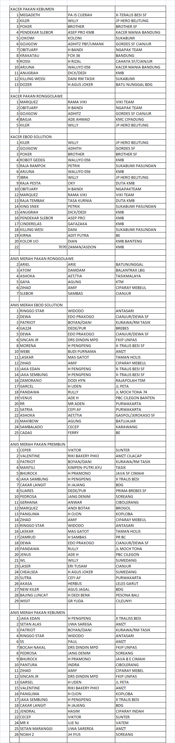 Data juara HUT TVRI Jabar 13 Maret, kelas kacer dan anis merah