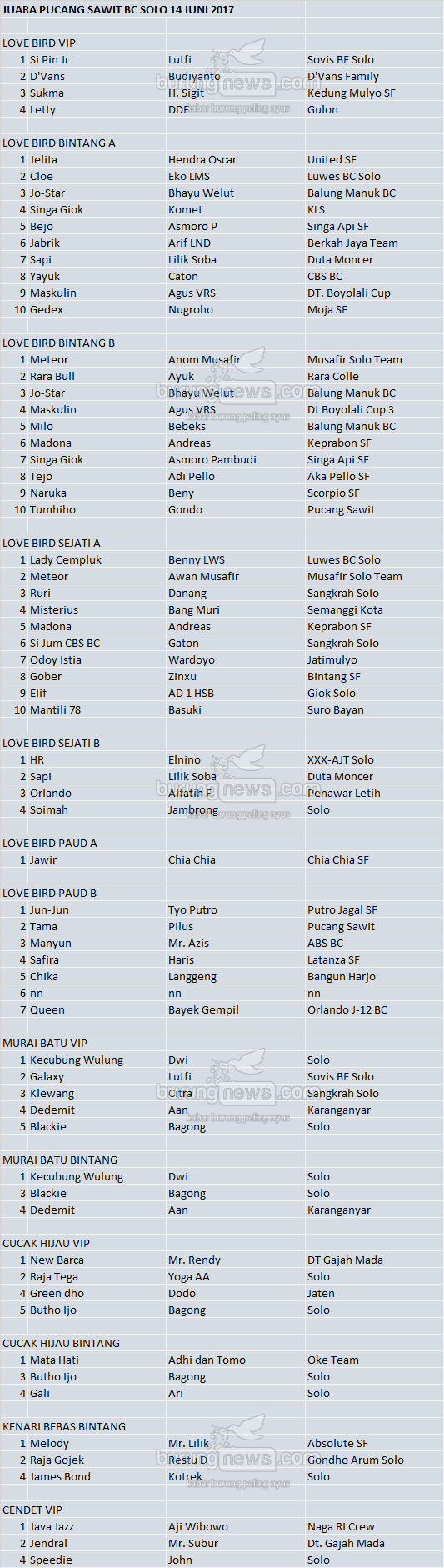 Judul : JUARA PUCANG SAWIT BC SOLO 14 JUNI 2017