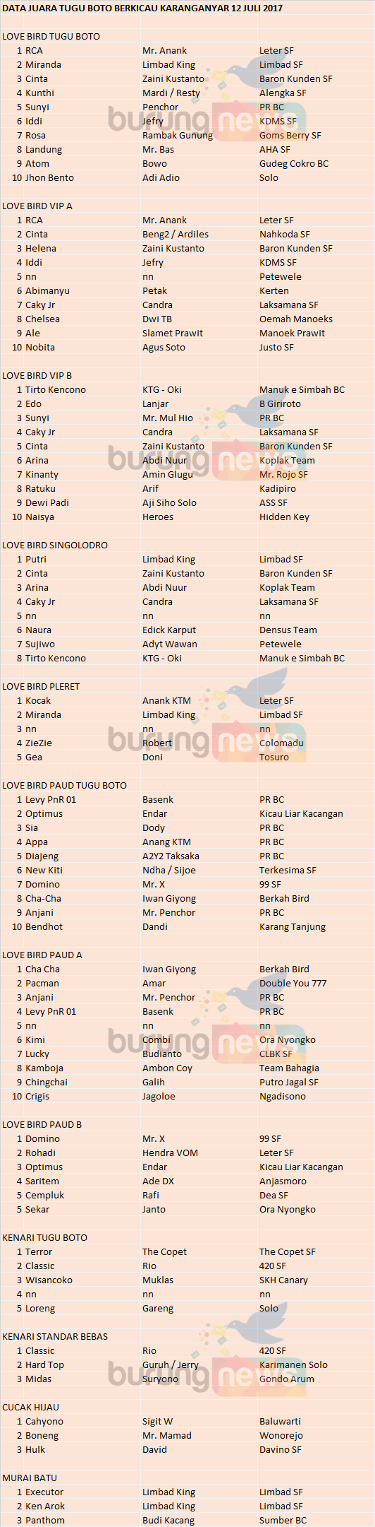 Judul : DATA JUARA TUGU BOTO BERKICAU 12 JULI 2017