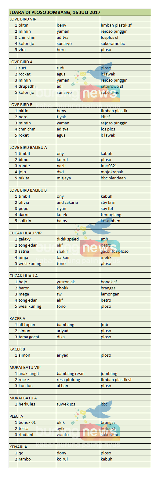 Judul : DATA JUARA PLOSO BC JOMBANG, 16 JULI 2017