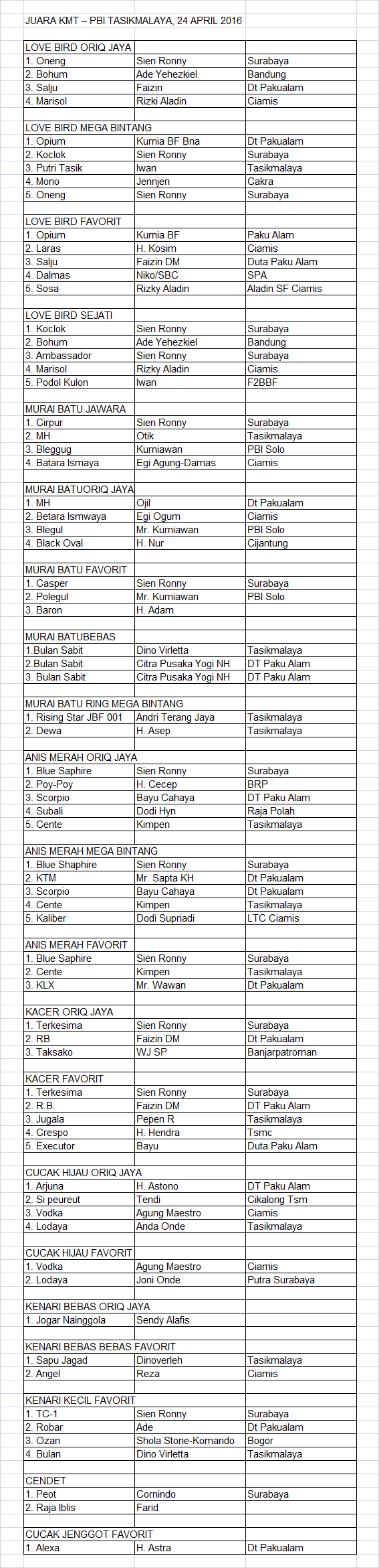 Deskripsi :Data juara KMT PBI Tasikmalaya, Minggu 24 April 2016 di Hotel Pajajaran Tasikmalaya