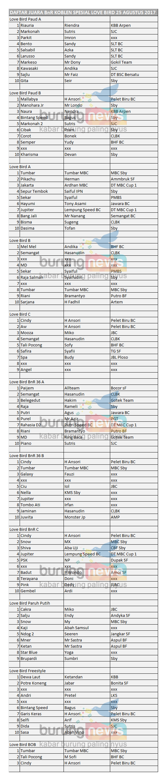 Judul : DATA JUARA BnR KOBLEN SPESIAL LOVE BIRD 25 AGUSTUS 2017