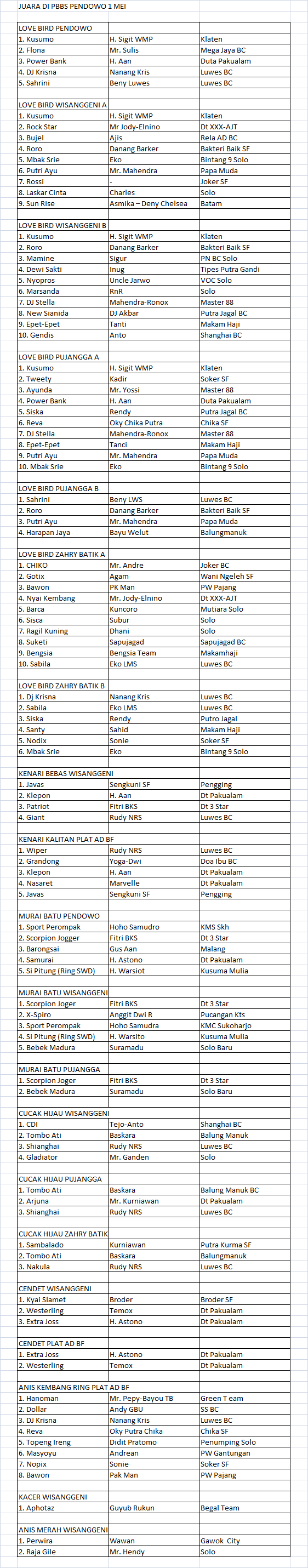 Data juara Launching PBBS Pendowo Sukoharjo, 1 Mei 2016