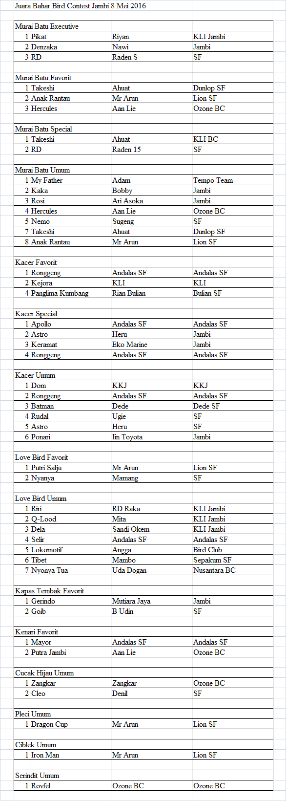 data juara Bahar Bird Contest Jambi, Minggu 8 Mei 2016