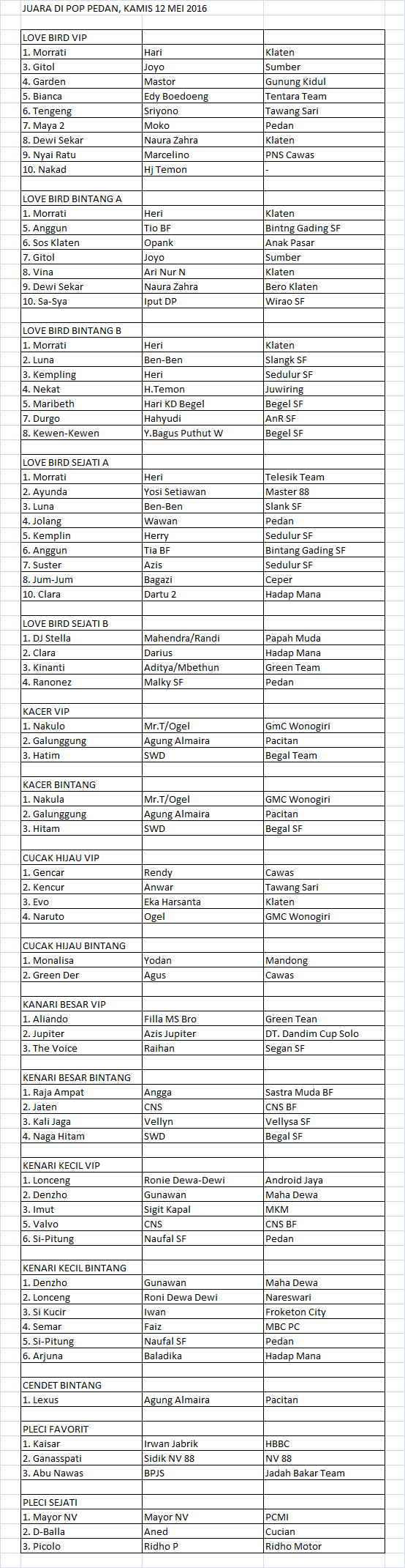 Data juara POP Pedan Klaten, Kamis 12 Mei 2016