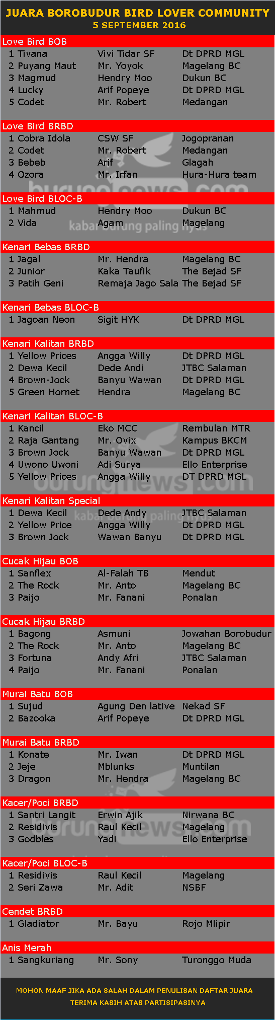 Judul : JUARA BOROBUDUR BIRD LOVER COMMUNITY 5 SEPT