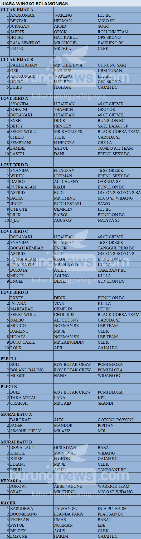 Hasil Lomba Burung