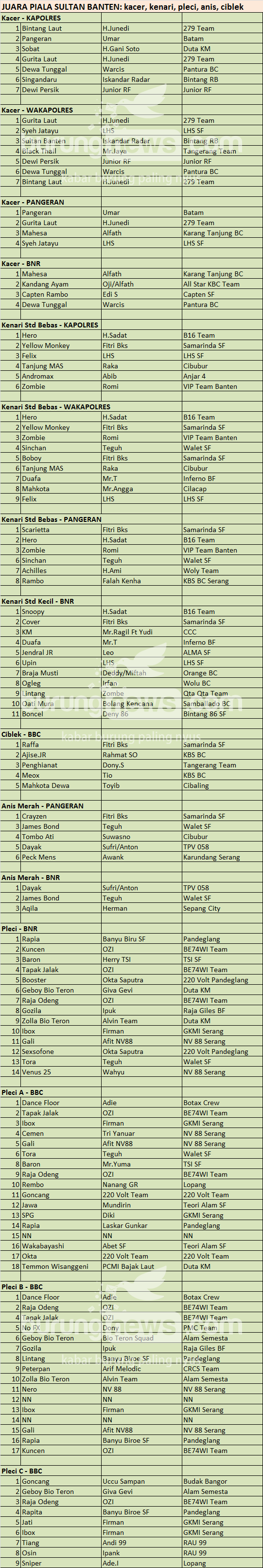Judul : JUARA SULTAN BANTEN: KACER, KENARI, PLECI, ANIS, CIBLEK