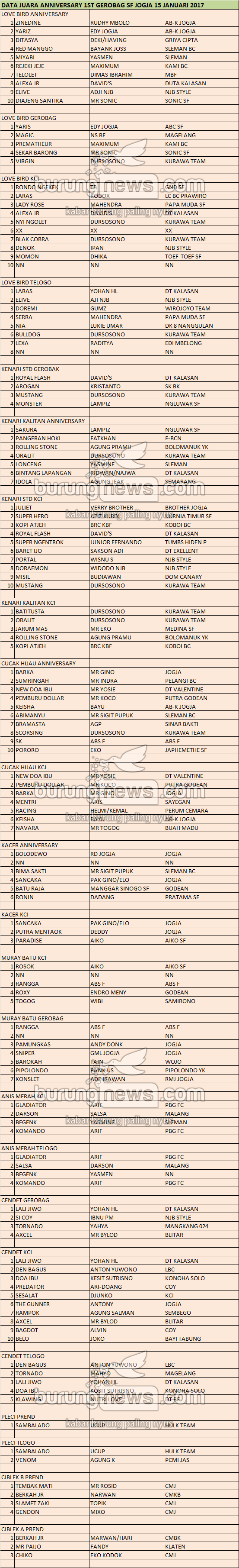 DATA JUARA LATBER KAMIS GALANG ARENA, KEPANJEN – MALANG: MB Joko Kendil dan CH Jabrix Double Winner, Kenari Stabil 4 Sesi