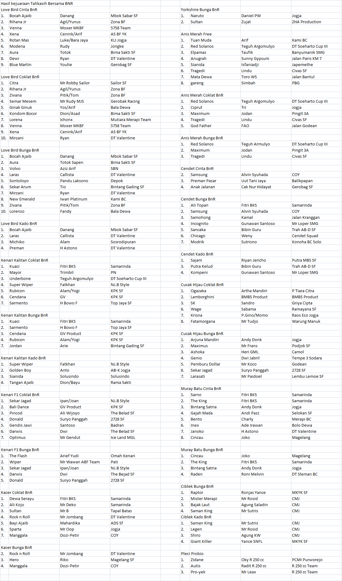DATA juara kontes Tali Kasih BnR Tlagaerja Jogja, Minggu 7 Februari 2016