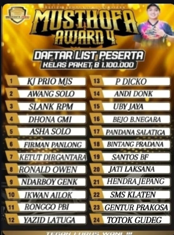 Musthofa Award 4 akan digelar Minggu 2 November 2025 di Rocket Arena Yogyakarta. Event akan menggunakan team juri dari Solo High Class (SHC) plus (+). Sebagai bagian dari keterbukaan, nama-nama juri pun diungkap.