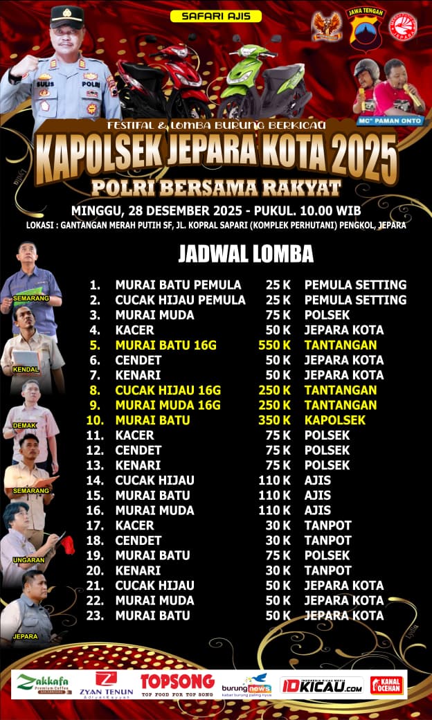 KAPOLSEK JEPARA KOTA GTG MERAH PUTIH SF, KOMPLEK PERHUTANI PENGKOL Minggu, 28 Desember 2025 Jam 10:00 Diliput oleh burungnews.com DOWNLOAD BROSUR DOWNLOAD JADWAL LOMBA