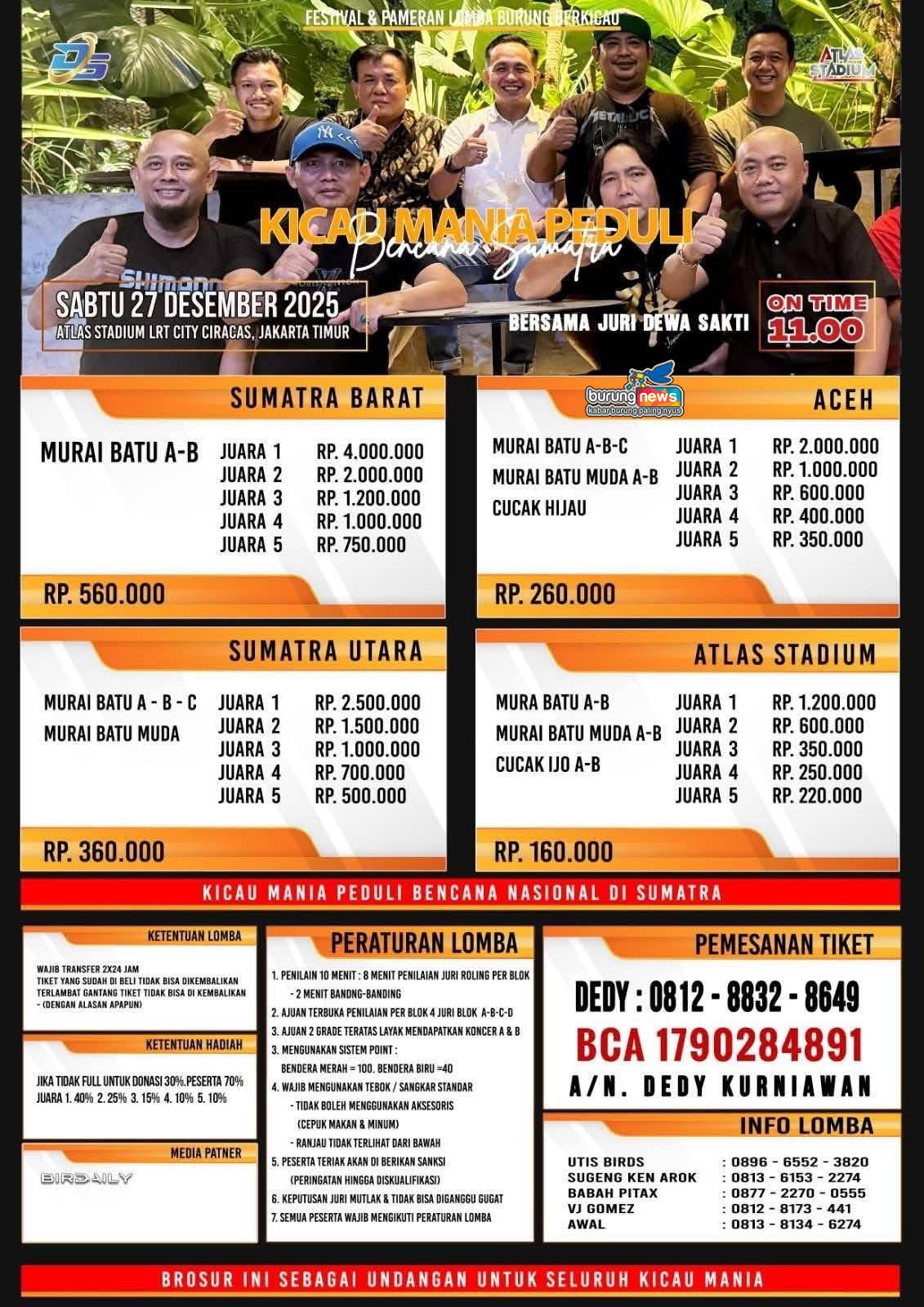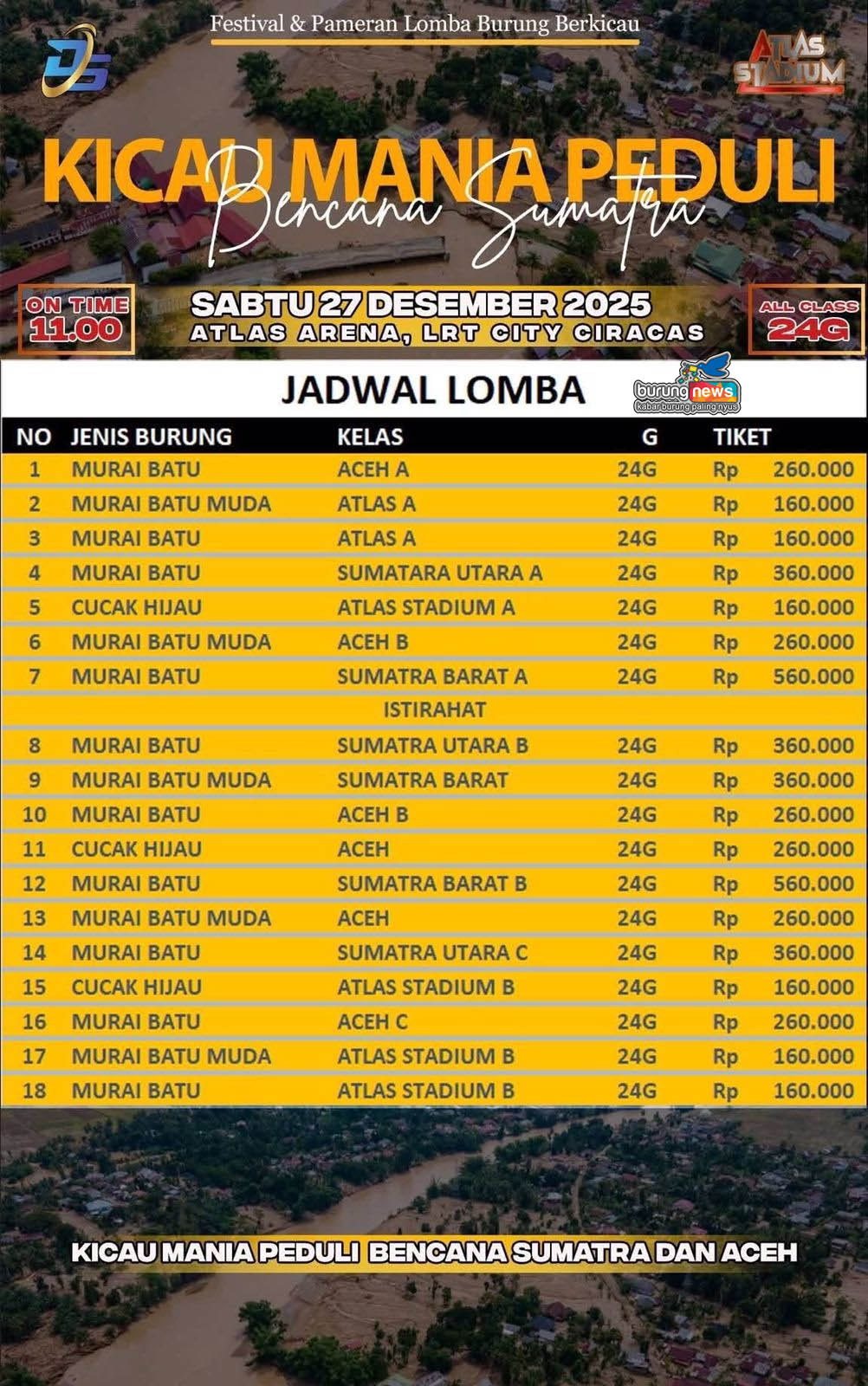 KICAU MANIA PEDULI BENCANA SUMATERA ATLAS STADIUM Sabtu, 27 Desember 2025 Jam 10:00 DOWNLOAD BROSUR DOWNLOAD JADWAL LOMBA