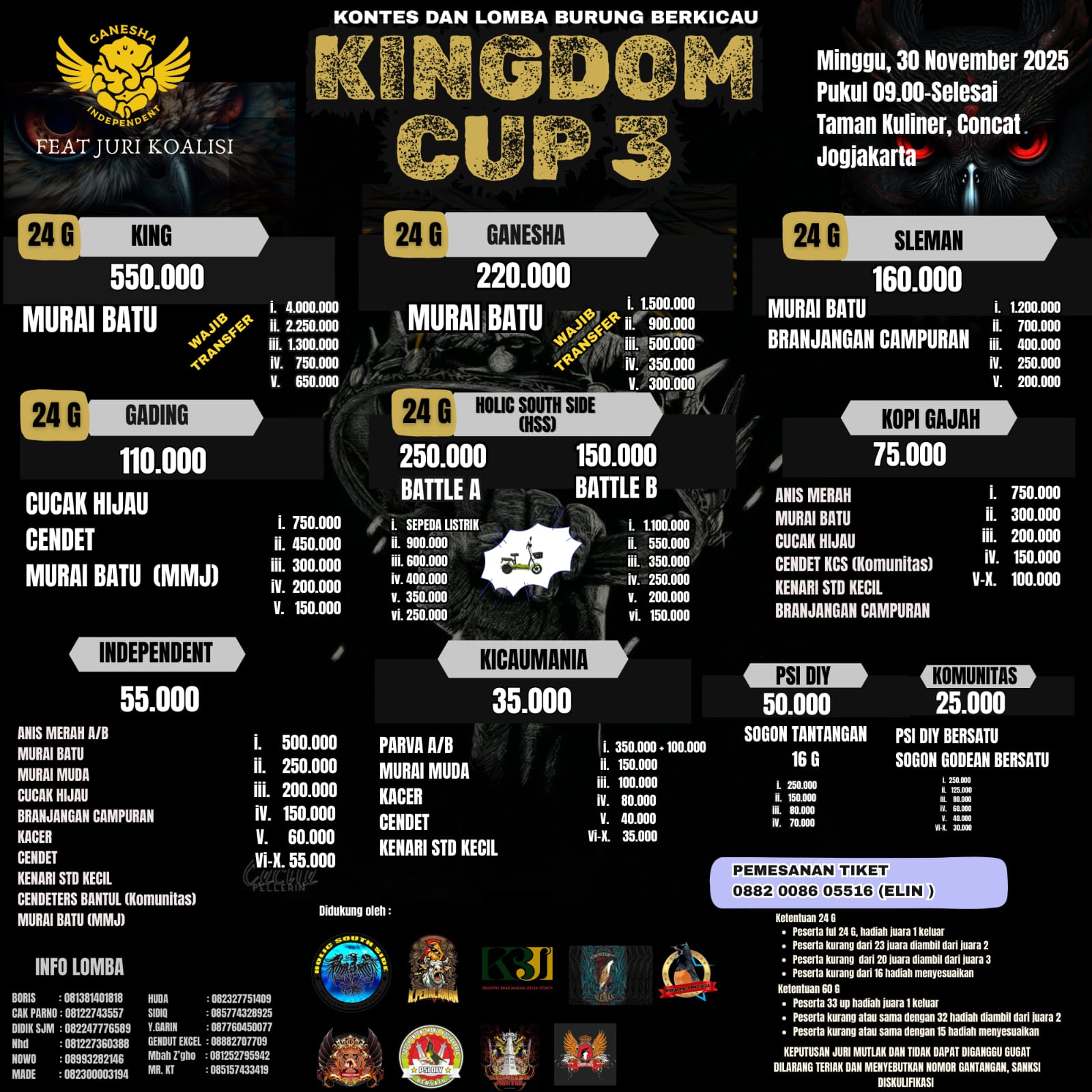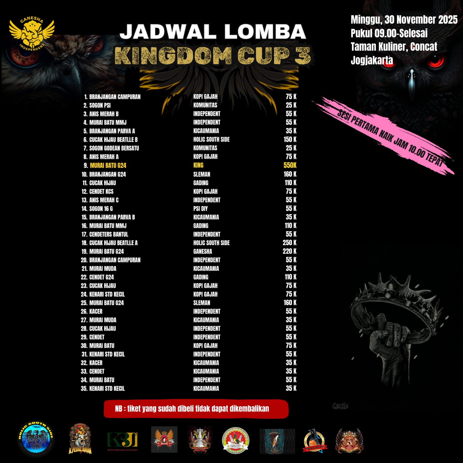 KINGDOM CUP 3 TAMAN KULINER CONDONG CATUR Minggu, 30 November 2025 Jam 10:00 Diliput oleh burungnews.com DOWNLOAD BROSUR DOWNLOAD JADWAL LOMBA