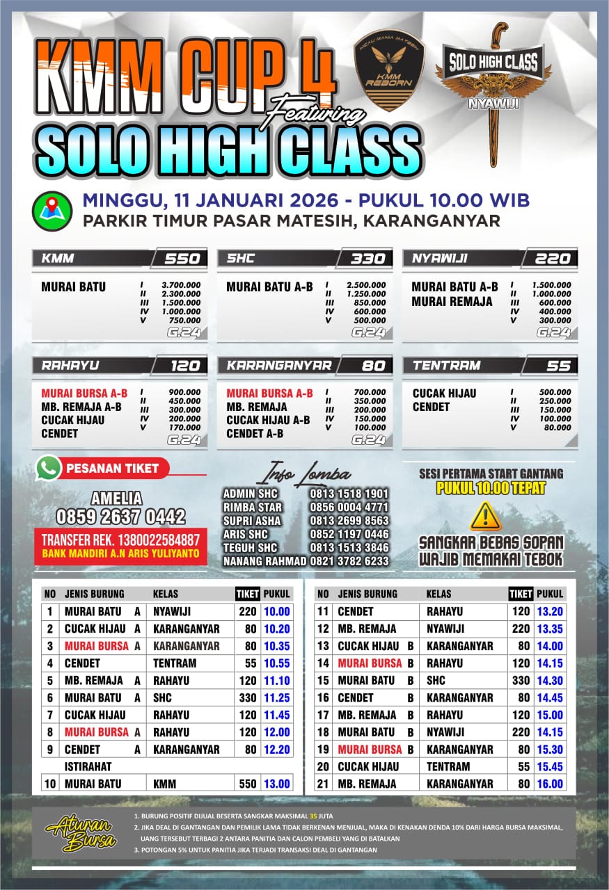KMM CUP 4 FEAT SOLO HIGH CLASS PARKIR TIMUR PASAR MATESIH Minggu, 11 Januari 2026 Jam 10:00 Diliput oleh burungnews.com DOWNLOAD BROSUR