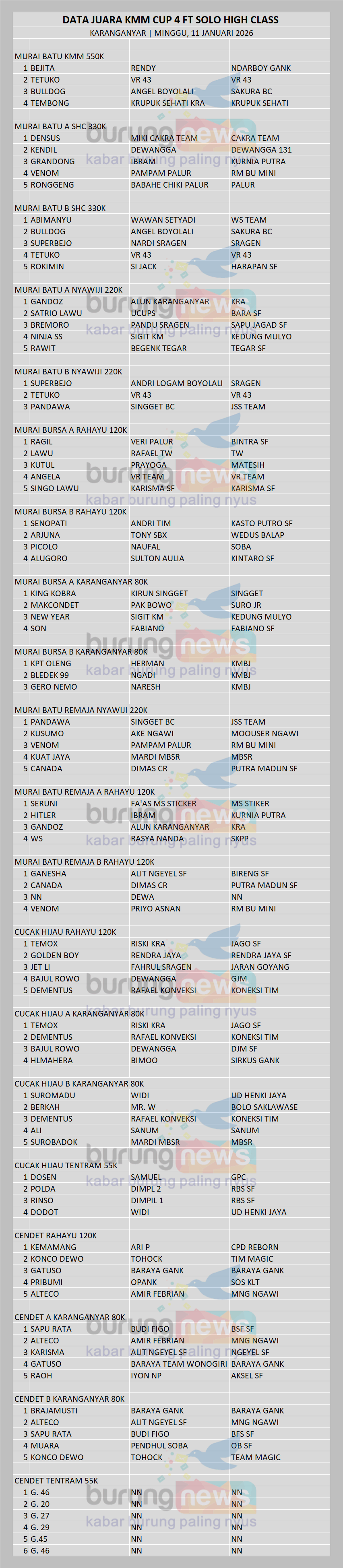 Murai batu Bejita milik Rendy Ndarboy Team keluar sebagai pemenang di partai utama KMM Cup 4 Feat Solo High Class. Di kelas lain, cucak hijau Temox andalan Jago SF berhasil meraih dua kali juara pertama alias double winner.